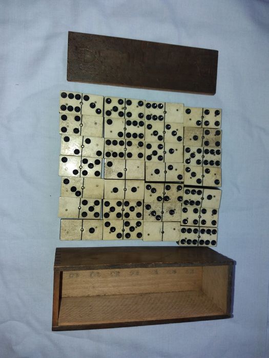 Antike viktorianische Domino 28 Fliesen - Holz-Knochen-Ebenholz-Messing - Erste Hälfte des 20. Jahrhunderts