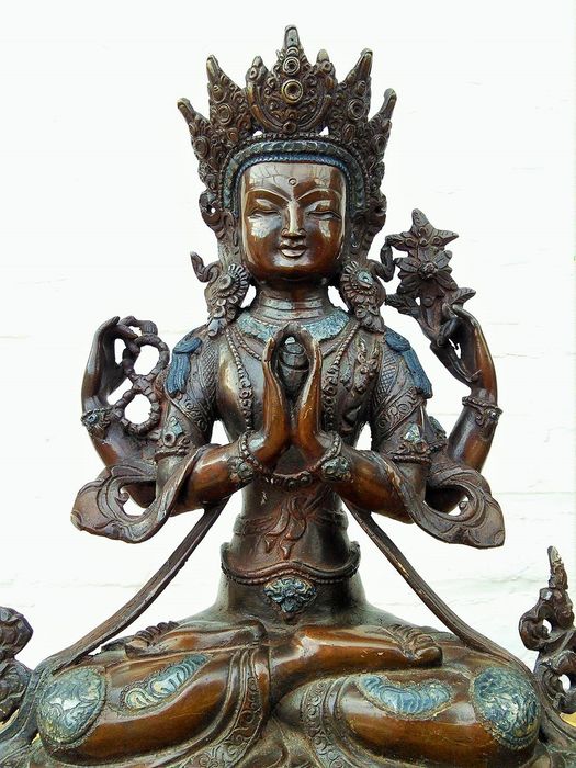 Avalokitśvara – Große polychrome Bronzestatue mit doppelter Lotusposition mit Attributen – Bronze, Rotes Kupfer – H33.5cm – Nepal – Ende des 20. Jahrhunderts