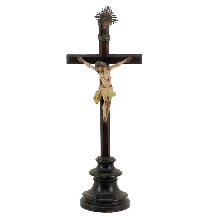 Christus im Holz mit Kreuz im Pau Santo – Satinholz, Silber – Ende des 19. Jahrhunderts