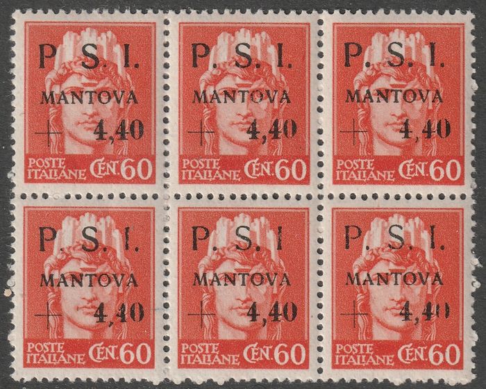 CLN – Mantua 1945 – 4.40 l. on 60 c. orange without dot after I in block of 6 centred, intact and rare – Sassone N.7+7x