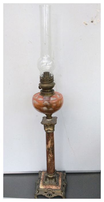 Eine schöne, unbeschädigte französische Petroleumlampe - Metall, Kupfer, Marmor, Glas - ungefähr 1935