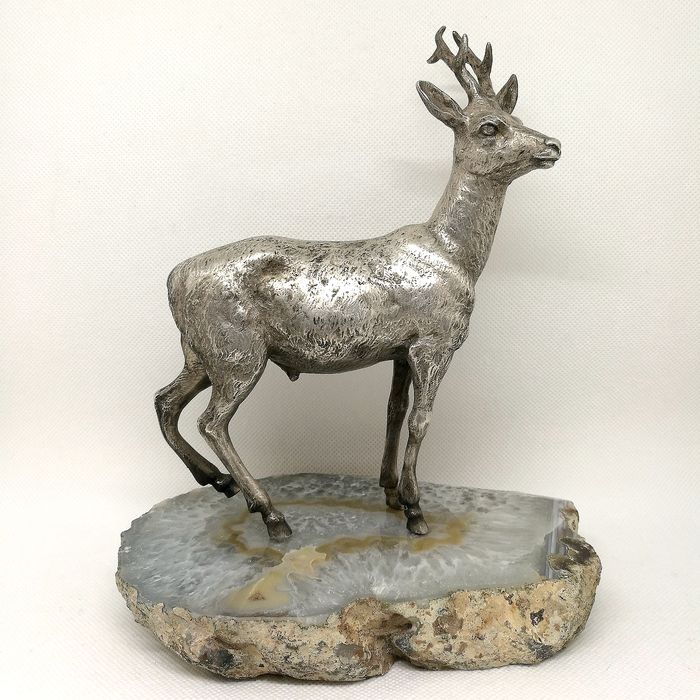 Figur, Skulptur, die Rehwild darstellt - .800 Silber, Mineral - Italien - Mitte des 20. Jahrhunderts