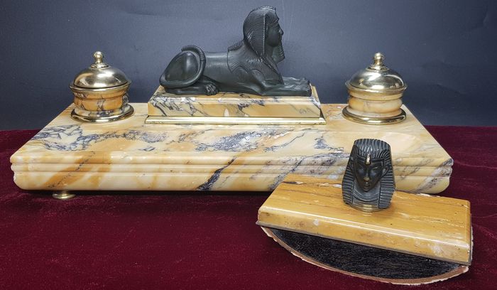 Inkwell Egyptian Revival Sphinx - Napoleon III. - Bronze (patiniert), Bronze (vergoldet), Glas, Marmor - Ende des 19. Jahrhunderts