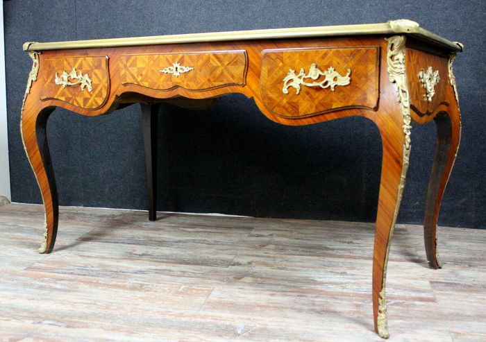 Laut Charles Cressent großer flacher doppelseitiger Schreibtisch in Edelholz-Intarsien – Holz – Ende des 19. Jahrhunderts
