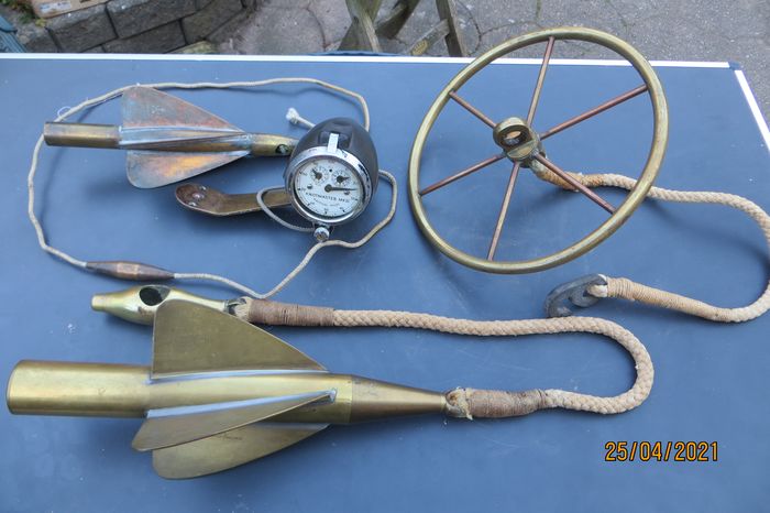 Schiffsprotokolle, Schwungrad und Blockuhr (maritim) (4) - Messing, Seil, Kunststoff - Erste Hälfte des 20. Jahrhunderts