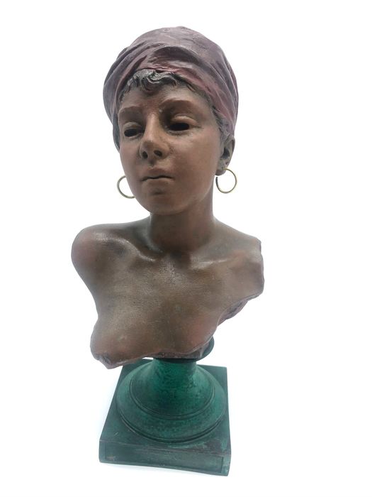 Villanis Emmanuel (1858-1914) - Skulptur, Büste nach Frau mit Kreolen und rotem Turban - Spelter mit brauner und roter Patina - Anfang des 20. Jahrhunderts